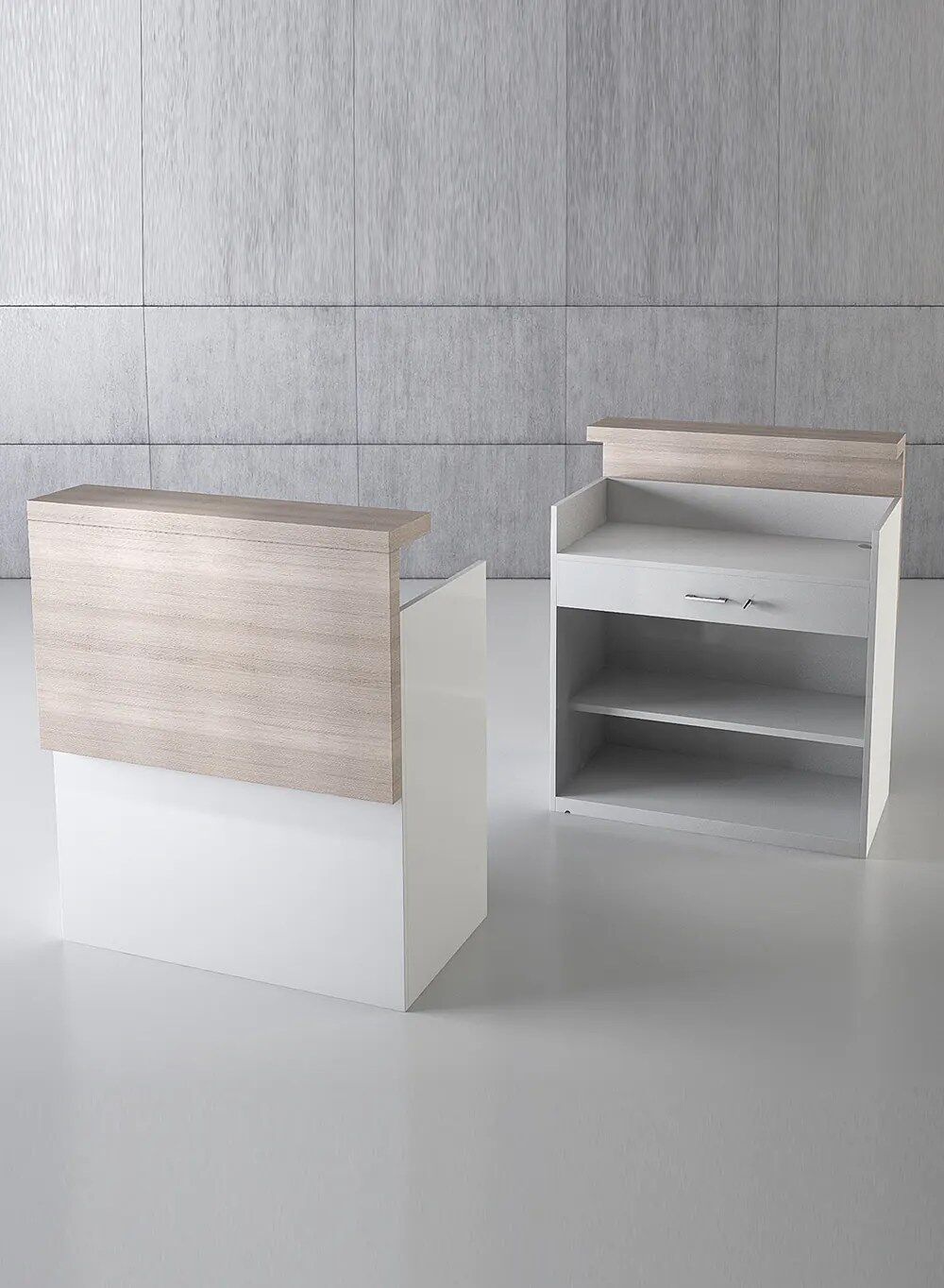 Ce meuble comptoir présente une surface de travail spacieuse, idéale pour recevoir vos clients et effectuer des transactions.