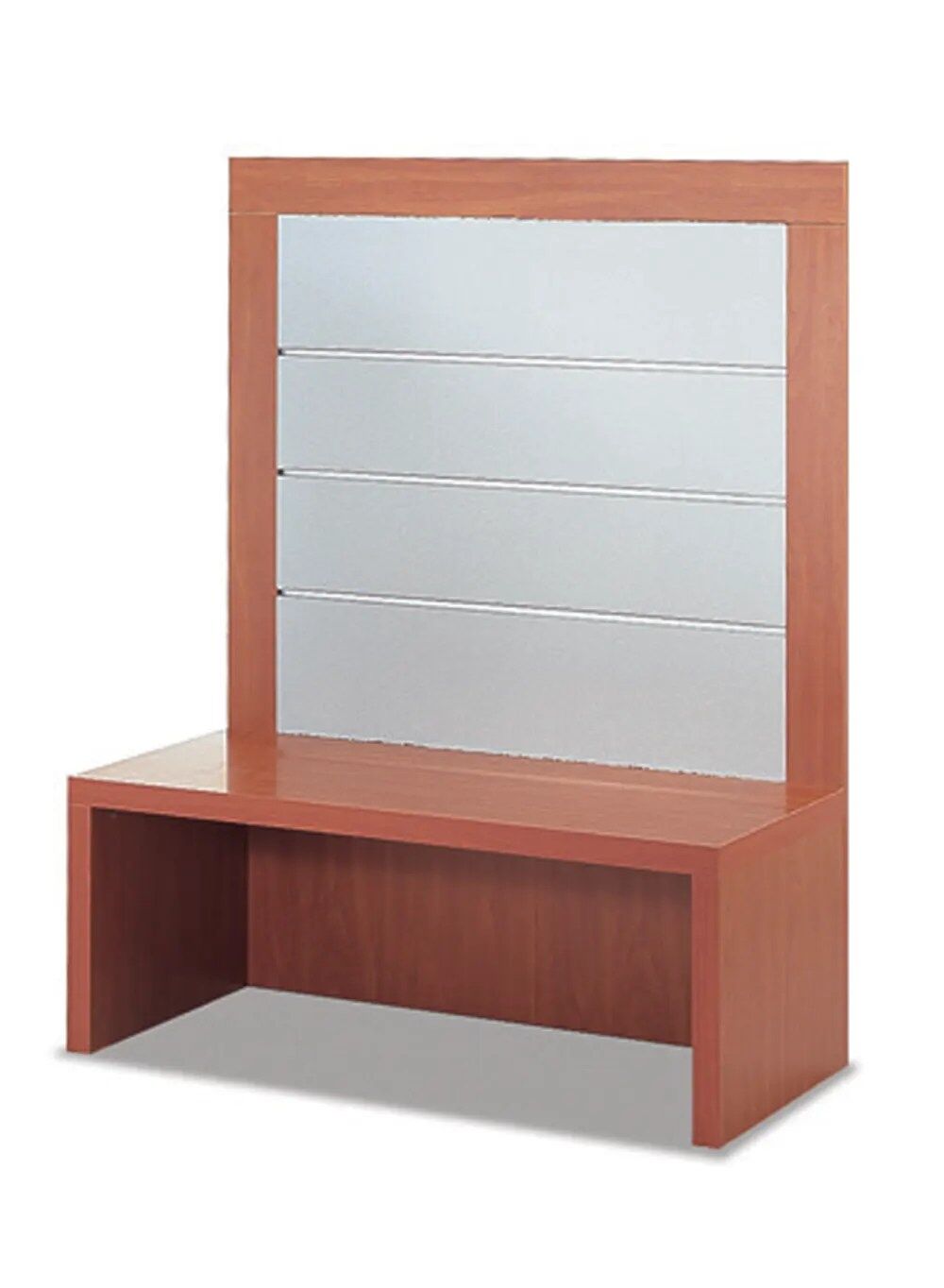 Grâce à sa grille murale, vous pouvez installer des crochets de fixation. Vous organisez ainsi vos produits librement, selon vos préférences. Le présentoir mesure 104 cm de largeur, 3 cm d’épaisseur, 46 cm de profondeur au niveau du banc, et 140 cm de hauteur.