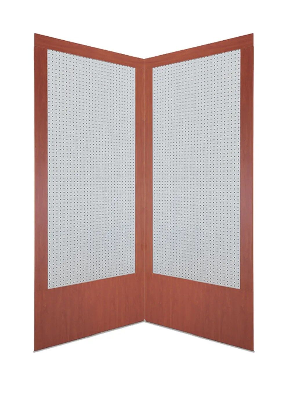 Chaque partie de ce double présentoir en angle droit mesure 90 cm de large, 3 cm de profondeur et 218 cm de hauteur. Cela offre un espace spacieux, idéal pour mettre en avant une variété d’articles.