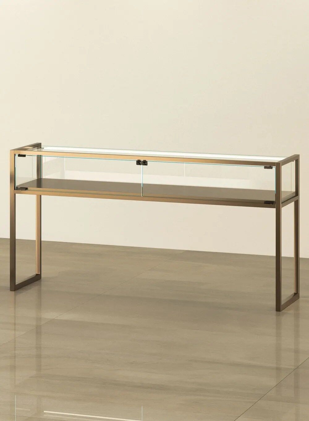 La structure métallique arbore une teinte bronze raffinée, qui enrichit visuellement votre espace d’exposition. À l’arrière, deux portes vitrées battantes s’ouvrent, chacune munie d’une serrure haute pour renforcer la sécurité des objets. De plus, des joints anti-poussière intégrés protègent chaque pièce exposée.