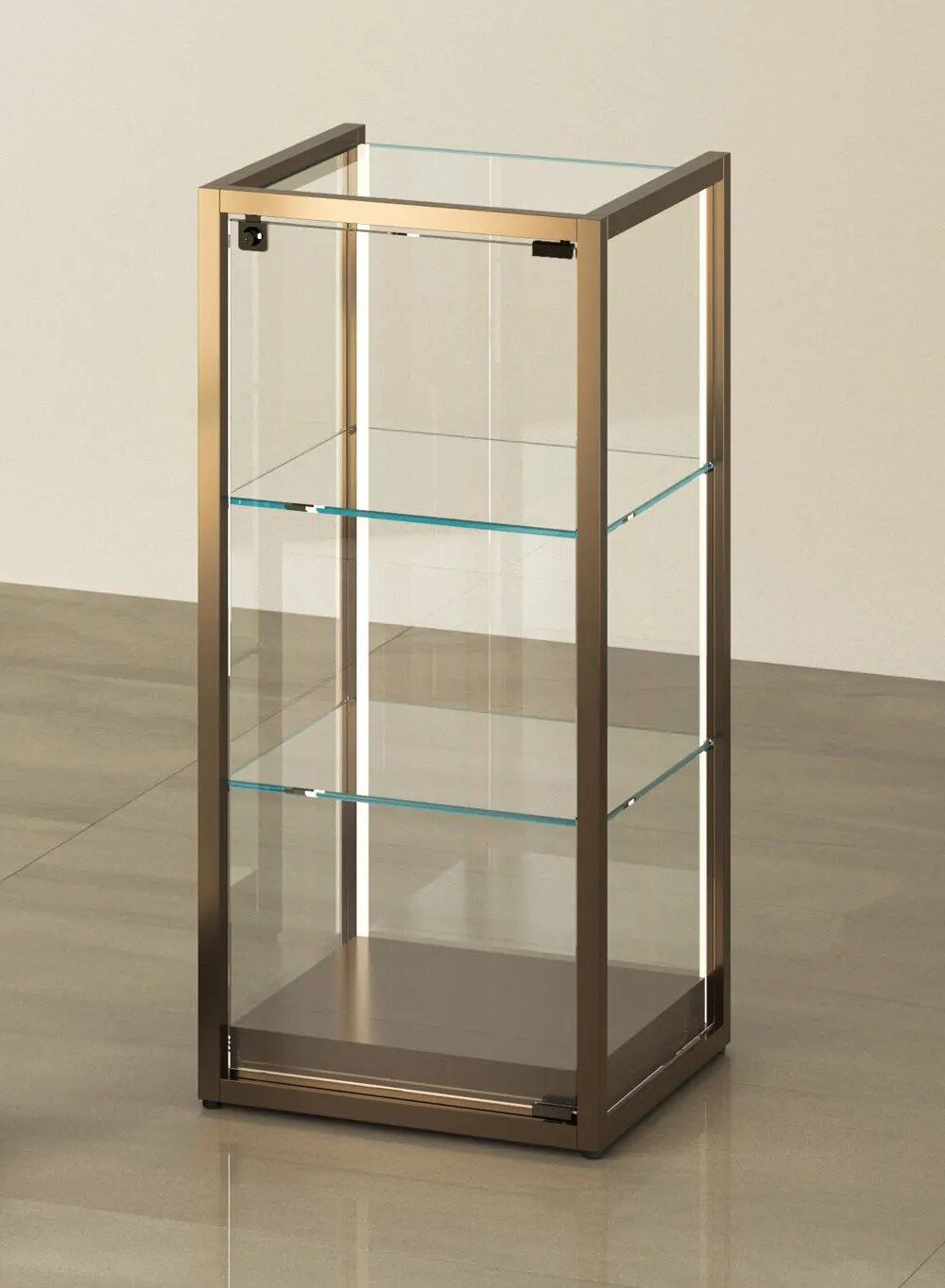 La structure métallique de cette vitrine arbore une élégante finition en bronze, apportant une touche de sophistication à votre espace d’exposition. Une porte vitrée battante est située à l’arrière, équipée d’une serrure positionnée en hauteur pour garantir la sécurité de chaque objet exposé. Des joints anti-poussière intégrés assurent une protection optimale pour vos pièces de collection.