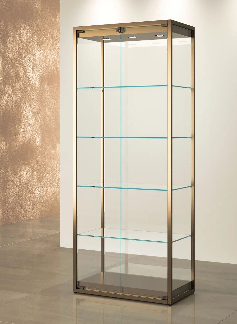 Sa structure métallique affiche une teinte bronze élégante, apportant raffinement à votre espace d’exposition. Elle intègre une double porte vitrée munie d’une serrure en partie supérieure, afin d’assurer une sécurité renforcée à vos pièces précieuses.